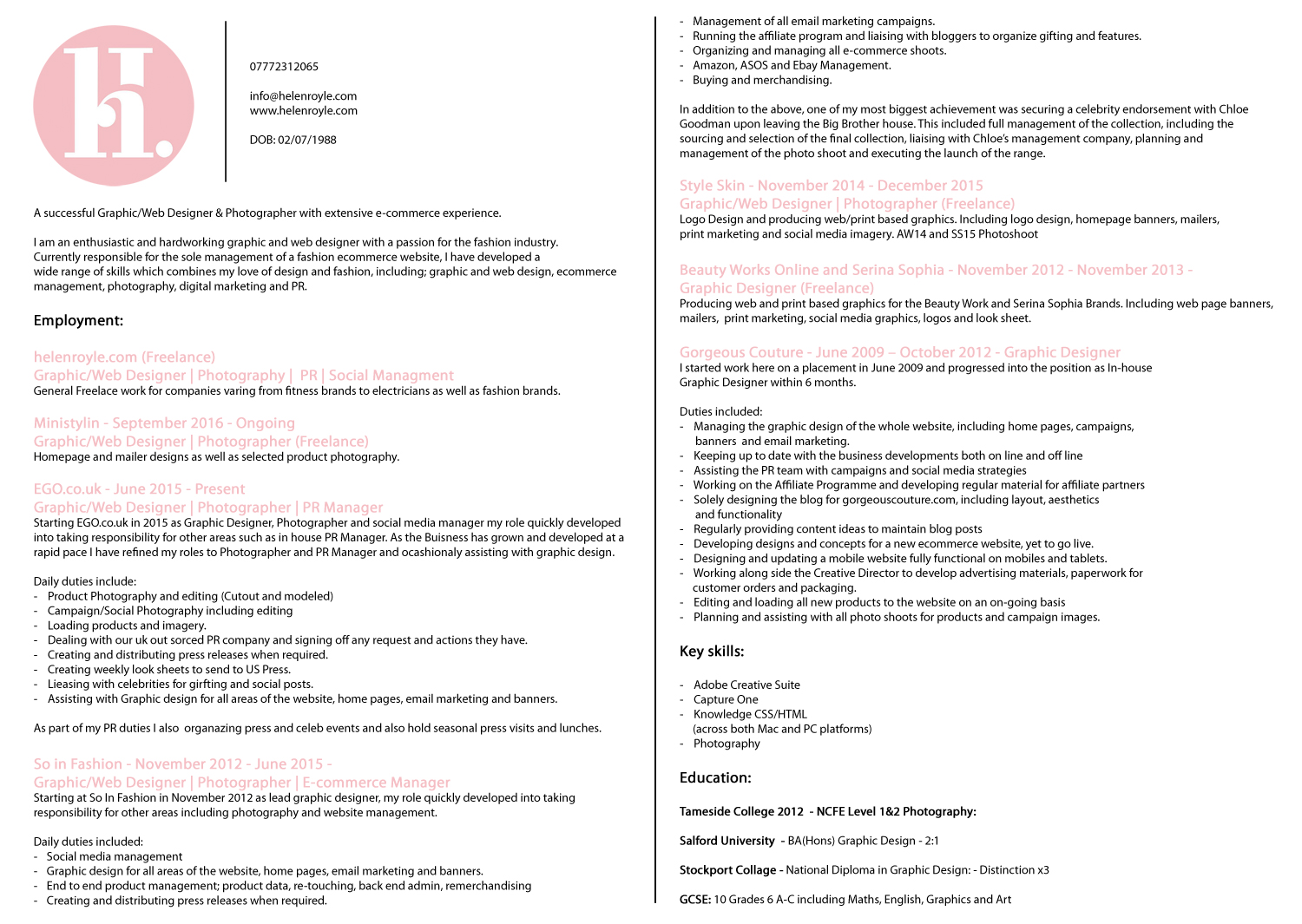Currently responsible for the sole management of a fashion ecommerce website, I have developed a wide range of skills which combines my love of design and fashion, including; graphic and web design, ecommerce management, photography, digital marketing and PR.